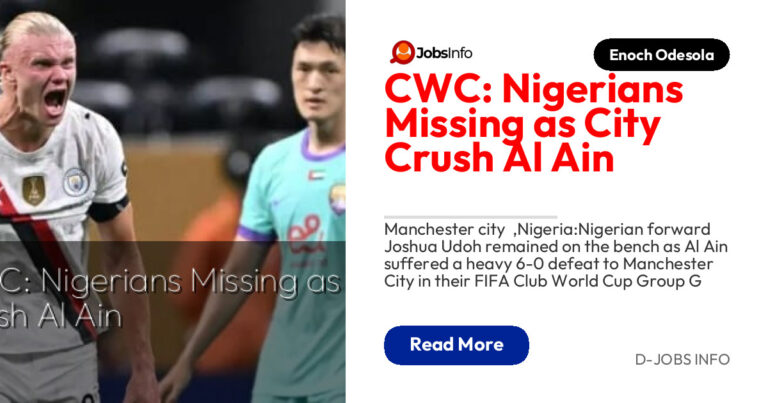 Manchester city ,Nigeria:Nigerian forward Joshua Udoh remained on the bench as Al Ain suffered a heavy 6-0 defeat to Manchester City in their FIFA Club World Cup Group G clash early Monday morning. Fellow Nigerians Rilwanu Sarki and Hassan Muhammed were again left out of the matchday squad. The emphatic victory sees Manchester City secure […]