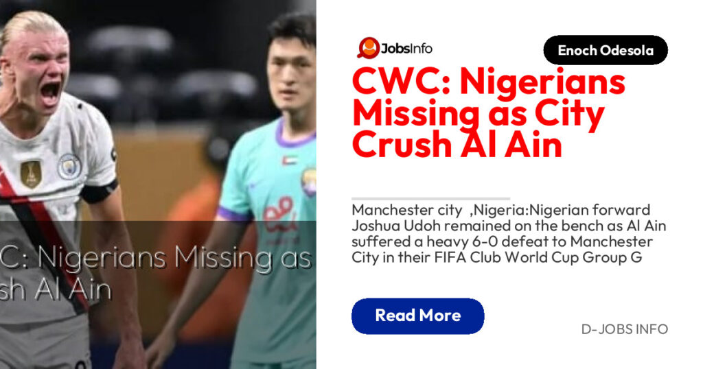 Manchester city  ,Nigeria:Nigerian forward Joshua Udoh remained on the bench as Al Ain suffered a heavy 6-0 defeat to Manchester City in their FIFA Club World Cup Group G clash early Monday morning. Fellow Nigerians Rilwanu Sarki and Hassan Muhammed were again left out of the matchday squad.