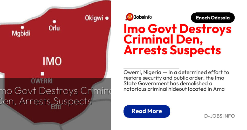 Several suspects were arrested at the site and handed over to security agencies for investigation and prosecution. A video of the demolition has since gone viral, highlighting the administration’s zero-tolerance stance on crime under Governor Hope Uzodimma.