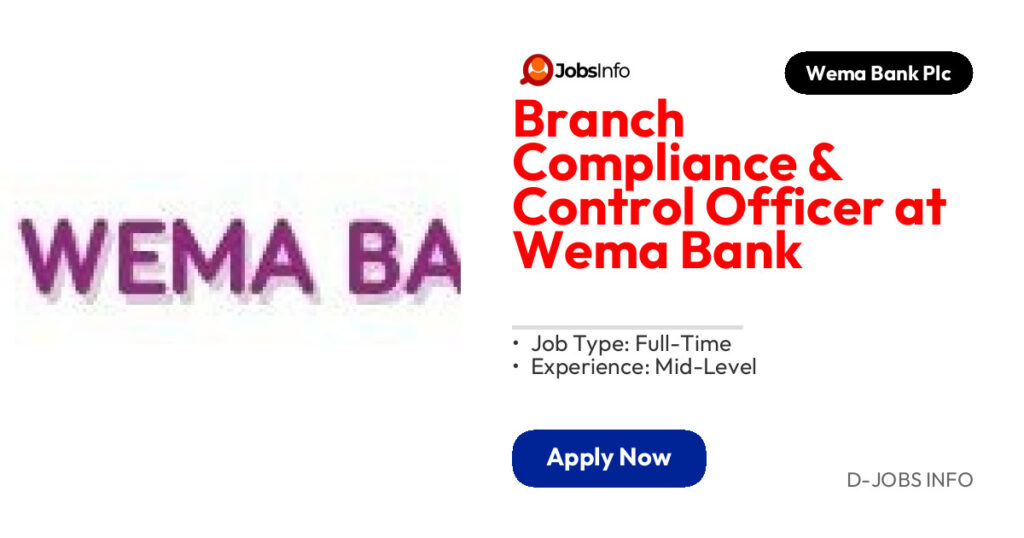 Wema Bank Plc is currently recruiting for the position of Branch Compliance & Control Officer as part of its commitment to enhancing internal control systems and ensuring regulatory compliance across all branches. This role is vital in upholding the bank’s control culture and ethical standards by monitoring branch operations and implementing compliance initiatives.