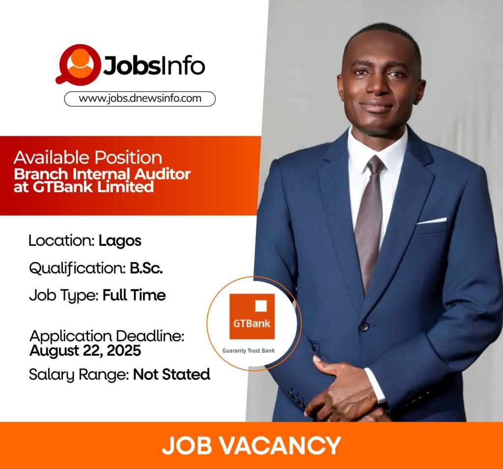 GTBank is seeking an experienced Branch Internal Auditor to join its dynamic team. The role involves risk-based auditing, ensuring regulatory compliance, and strengthening internal controls across branches. The successful candidate will contribute to safeguarding the bank’s assets, ensuring transparency, and enhancing operational efficiency.