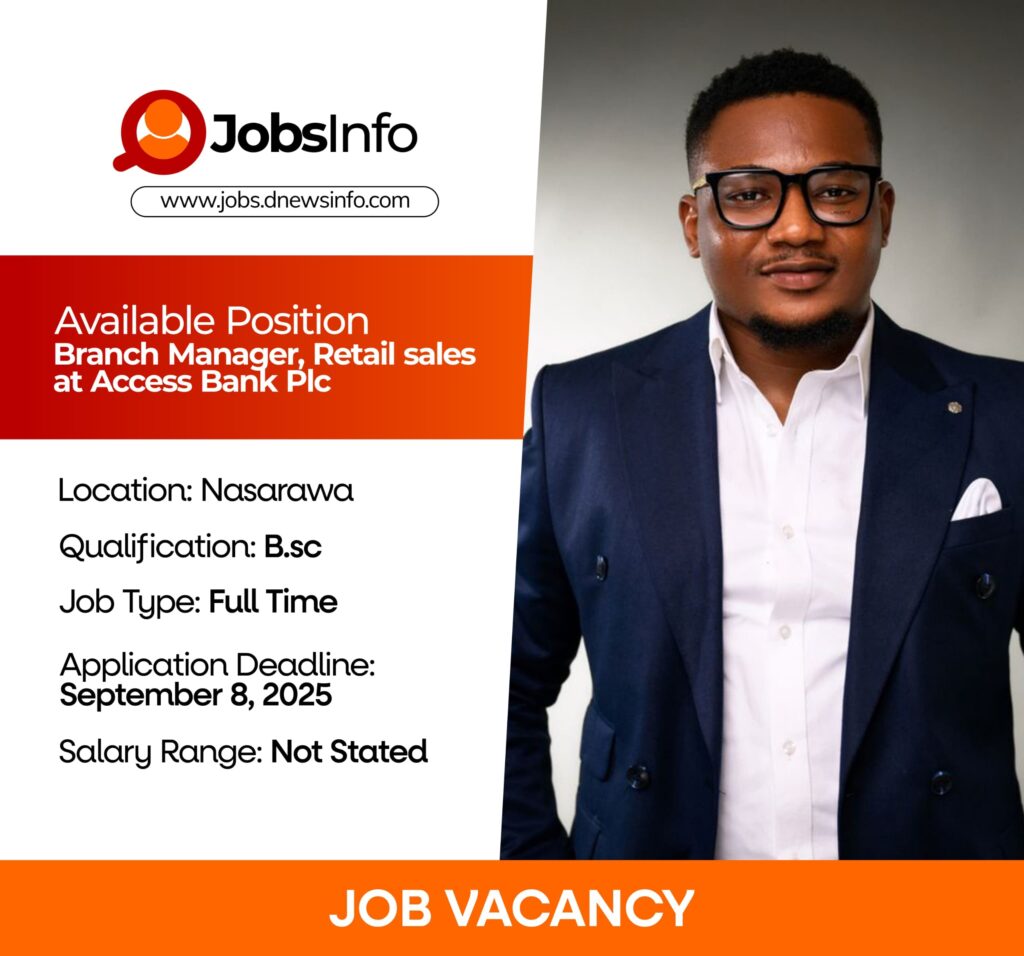 Access Bank is recruiting Branch Managers (Retail Sales) to lead operations in branches across Nasarawa, Benue, Gombe, Adamawa, Niger, and Potiskum.