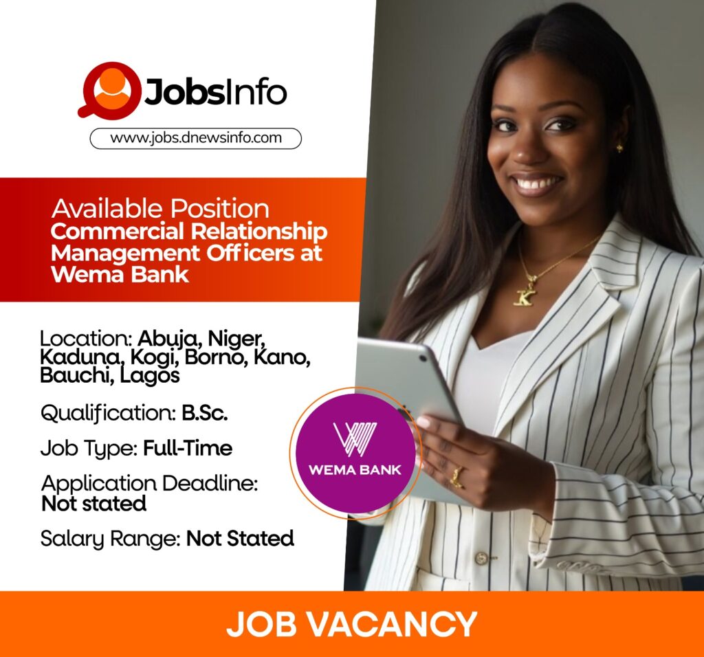 Wema Bank is seeking skilled and motivated Commercial Relationship Management Officers to join its dynamic team across multiple locations in Nigeria. The role involves building and maintaining strong client relationships, driving sales, and delivering excellent banking solutions tailored to customers’ needs.
