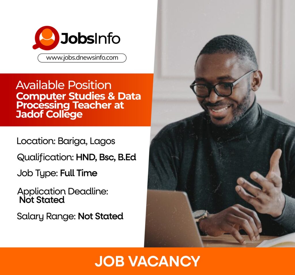 Jadof College is seeking an experienced and passionate Computer Studies & Data Processing Teacher to join its academic team. The ideal candidate will be responsible for teaching computer-related subjects, preparing lesson plans, and guiding students in acquiring practical ICT skills to support their academic and future career growth.