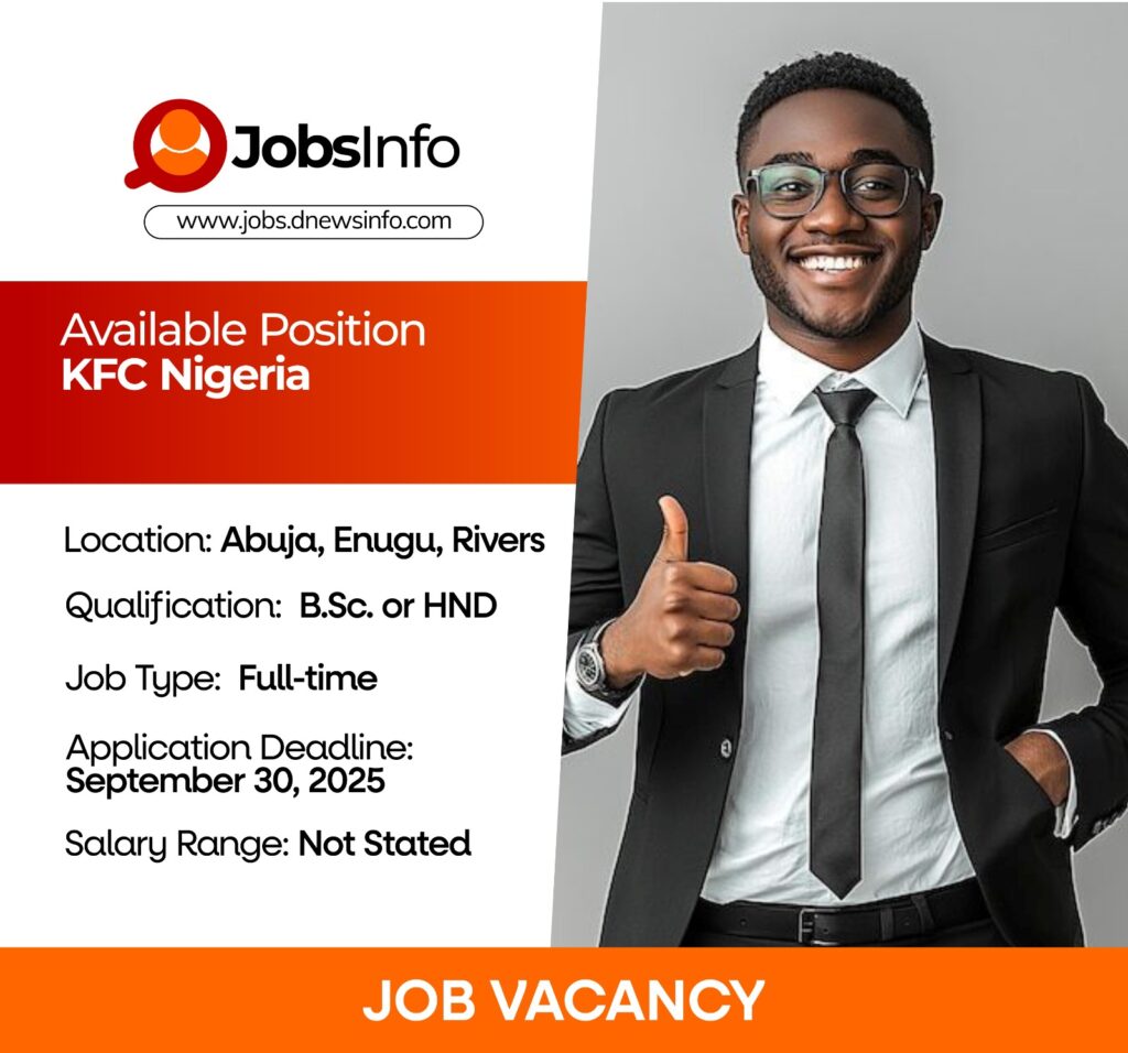 Qualified candidates should send their CVs to: hr@kfc-dinl.com. Use the job title and preferred location (e.g., Restaurant Manager – Enugu) as the subject of the email.