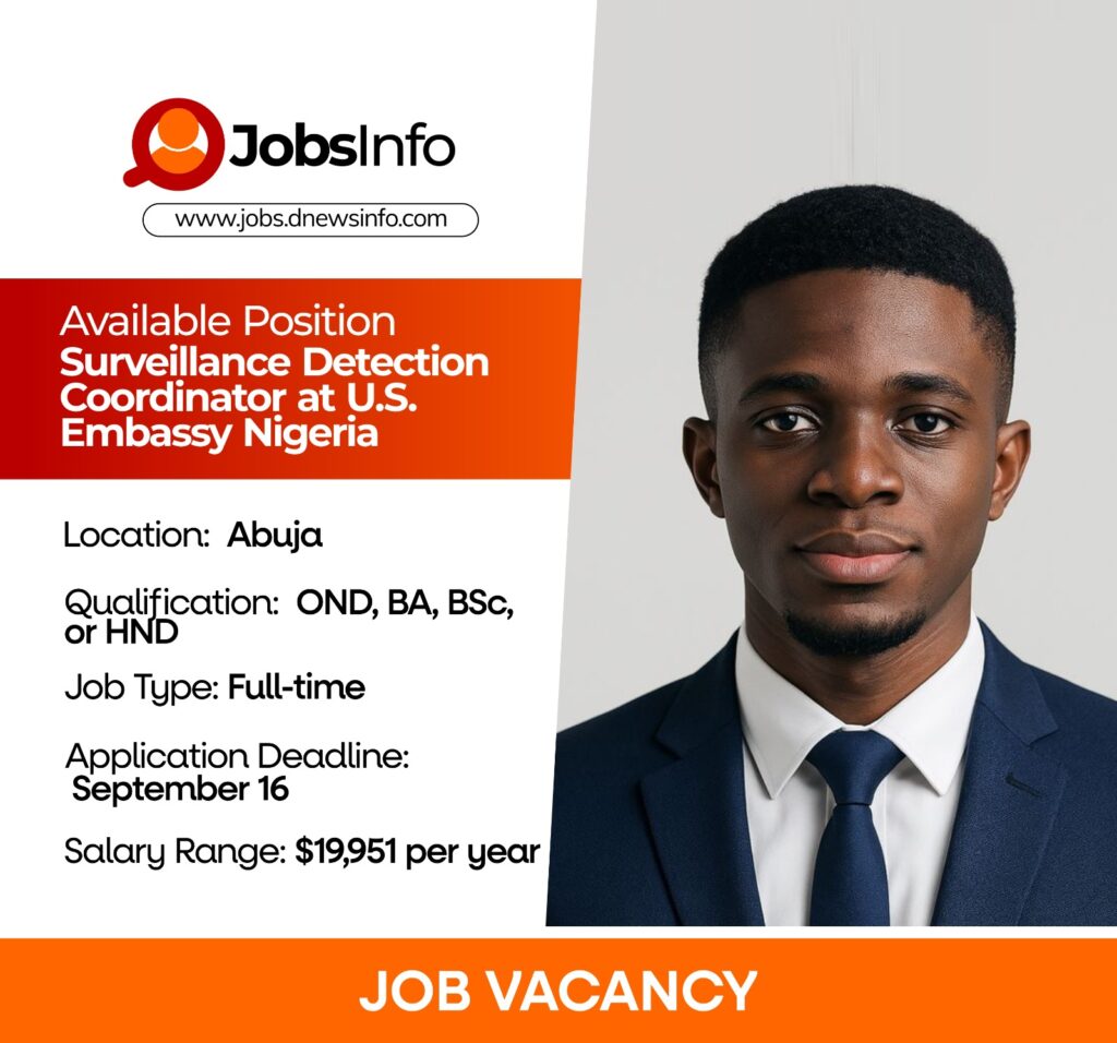The U.S. Embassy in Abuja invites applications from qualified candidates for the role of Surveillance Detection Coordinator (SDC) in the Regional Security Office (RSO).