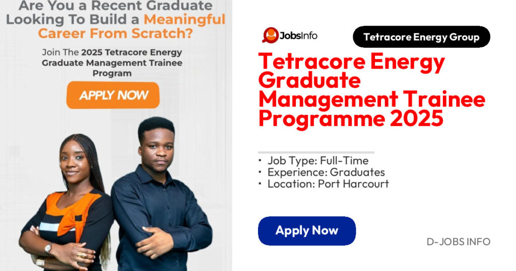 Tetracore Energy invites applications for its 2025 Graduate Management Trainee Programme—a 12-month, fully onsite training designed to prepare fresh graduates for leadership roles in the energy sector. The programme offers structured learning, hands-on exposure, and mentoring in a dynamic work environment.