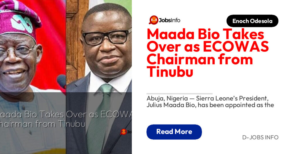 Abuja, NigeriaSierra Leone’s President, Julius Maada Bio, has been appointed as the new Chairman of the Economic Community of West African States (ECOWAS), following the conclusion of President Bola Ahmed Tinubu’s tenure.