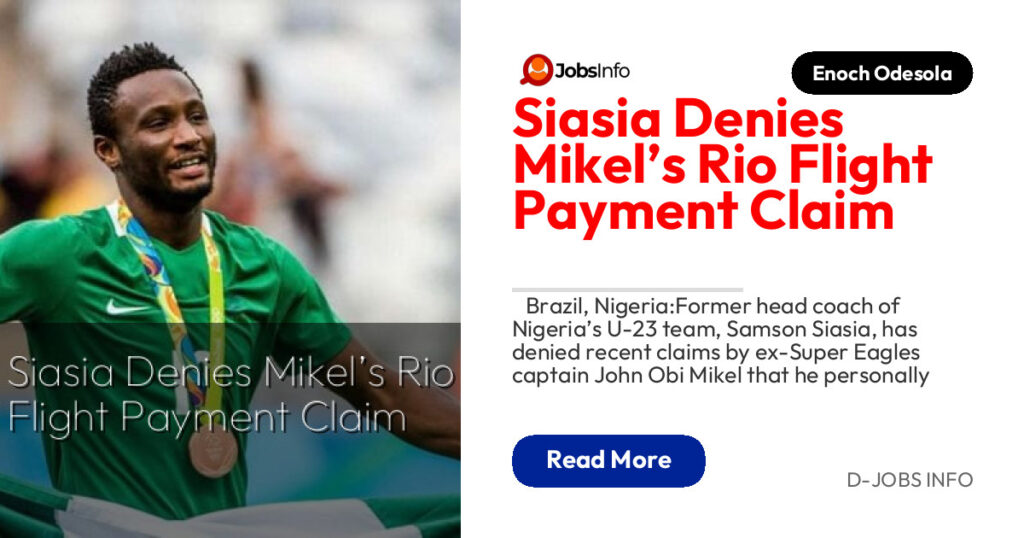 Brazil, Nigeria:Former head coach of Nigeria’s U-23 team, Samson Siasia, has denied recent claims by ex-Super Eagles captain John Obi Mikel that he personally funded the team’s flight to the 2016 Rio Olympics in Brazil.